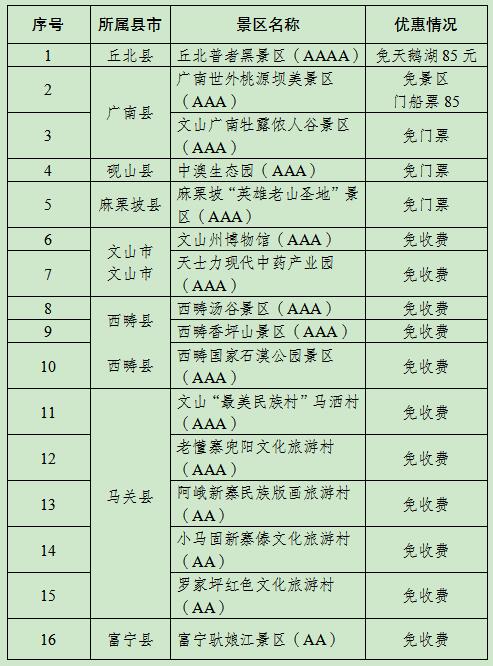 优免政策:本人享受在文山州内3日住宿、交通、景区游览项目全免费,其随同亲属享受五折优惠措施。