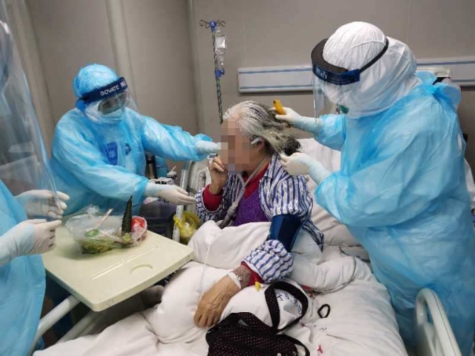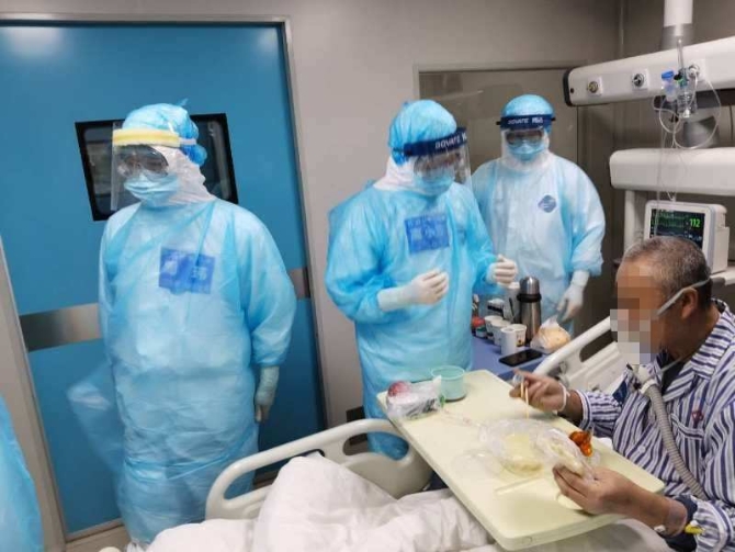2月23日上午10点多,病轻相对轻一点的男性危重型患者明显感觉身体轻松了,原本一直卧床不起的他甚至下地走了走,信心提升了不少。69岁老奶奶的病情也有所缓解,呼吸频率下降到每分钟30次左右,氧饱和度最好时能达到96%。