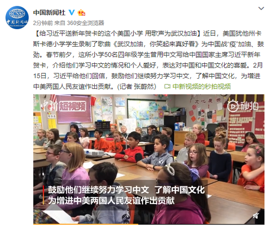 近日,美国犹他州卡斯卡德小学学生录制了歌曲《武汉加油,你笑起来真好看》为中国战“疫”加油、鼓劲。春节前夕,这所小学50名四年级学生曾用中文写给中国国家主席习近平新年贺卡,介绍他们学习中文的情况和个人爱好,表达对中国和中国文化的喜爱。2月15日,习近平给他们回信,鼓励他们继续努力学习中文,了解中国文化,为增进中美两国人民友谊作出贡献。(记者 张蔚然)