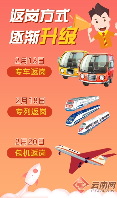 优化运力配置和调度,统筹协调国有运输骨干企业勇挑大梁,加大运力投入,开通“返岗直通车”,开展复工企业人员道路客运包车。(记者 李海球 云南网编辑范春艳 乐诚弘韵 王胤整理 制图 王元)