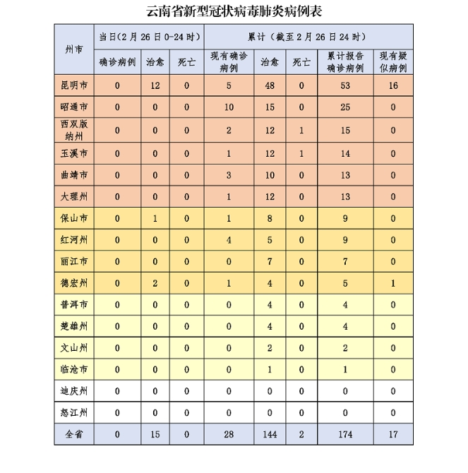 昆明信息港讯 机器人小明 2月26日12时至24时,无新增确诊病例。截至2月26日24时,全省累计确诊病例174例,治愈出院144例,死亡2例,现有确诊病例28例,其中重症1例。现有疑似病例17例。