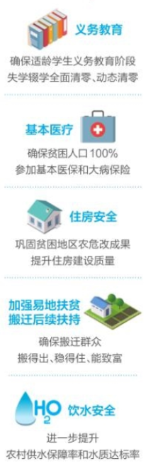 有效弥补“三保障”短板。在义务教育方面,确保适龄学生义务教育阶段失学辍学全面清零、动态清零。在基本医疗方面,持续加强乡村医生管理和培训,巩固贫困村卫生室标准化建设,提升基层医疗服务能力,强化家庭医生签约服务,确保贫困人口100%参加基本医保和大病保险。在住房安全方面,巩固贫困地区农危改成果,提升住房建设质量,确保遮风避雨、安全稳固和基本使用功能。在加强易地扶贫搬迁后续扶持方面,集中力量解决好搬迁群众产业、就业、基本公共服务、社区治理、社区党建、社会融入等问题,确保搬迁群众搬得出、稳得住、能致富。在饮水安全方面,继续实施农村饮水安全巩固提升工程,进一步提升农村供水保障率和水质达标率。