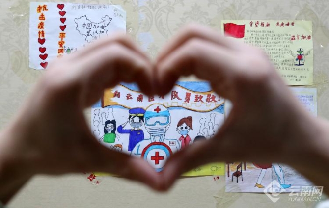 2月23日上午10点,云南省对口支援湖北咸宁医疗队员们上完夜班回到酒店,眼前的小图画和文字仿佛一股暖流流进了心里。来自咸宁外国语学校玉泉校区306班的65位小朋友给云南医疗队员们一份特殊的礼物中温馨的祝福、稚气的言语,让队员们卸下了一身的劳累。