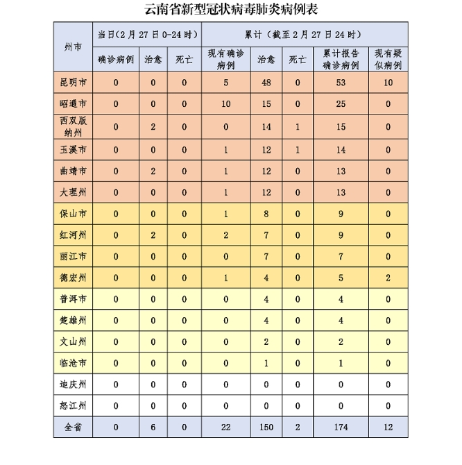 昆明信息港讯 机器人小明 2月27日12时至24时,无新增确诊病例。截至2月27日24时,全省累计确诊病例174例,治愈出院150例,死亡2例,现有确诊病例22例,无重症、危重症病例。现有疑似病例12例。