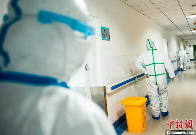 武汉市红十字会医院隔离病区,一位医生扶着腰在走廊上慢慢走动。战斗在一线的医护人员每天穿着密封的防护服长时间高强度工作,无法喝水、上厕所,只有吃饭时间能够短暂休息。中新社发 柯皓 摄 图片来源:CNSPHOTO