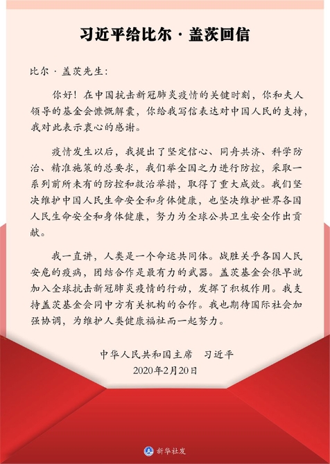 2月20日,在给美国盖茨基金会联席主席比尔·盖茨的回信中,习近平主席这样写道。