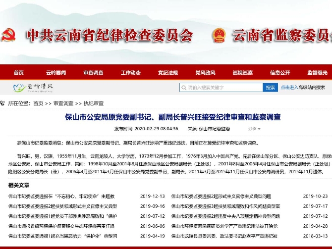 昆明信息港讯 机器人小明 据保山市纪委监委消息:保山市公安局原党委副书记、副局长普兴旺涉嫌严重违纪违法,目前正在接受纪律审查和监察调查。