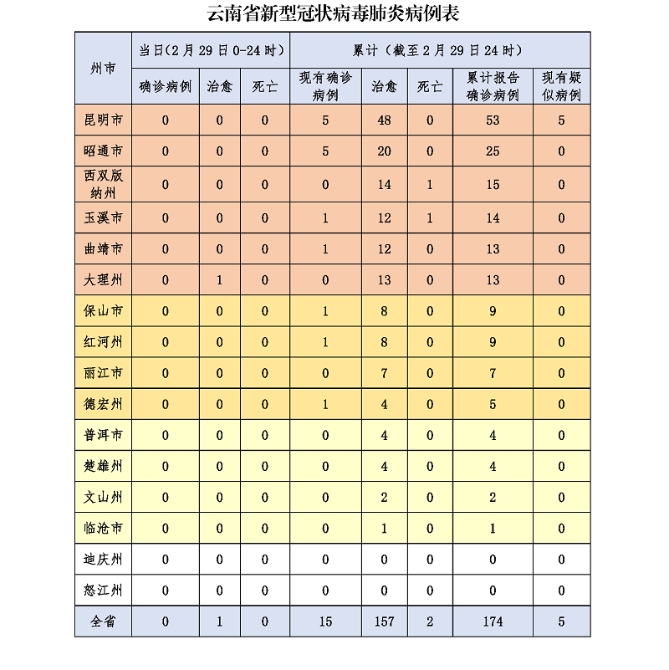昆明信息港讯 机器人小明 2月29日12时至24时,无新增确诊病例。截至2月29日24时,已连续9天新增病例为0,全省累计确诊病例174例,治愈出院157例,死亡2例;现有确诊病例15例,无重症、危重症病例;现有疑似病例5例。密切接触者当日解除医学观察39人,正在观察118人。