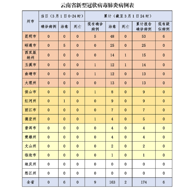 3月1日12时至24时 云南新增0例累计174例