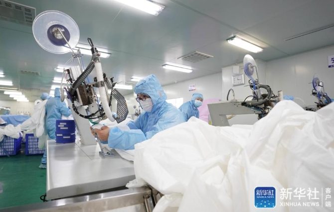 在位于湖北省仙桃市的湖北裕民防护用品有限公司生产车间内,工人们加紧生产医用防护用品(1月28日摄)。新华社记者 李贺 摄