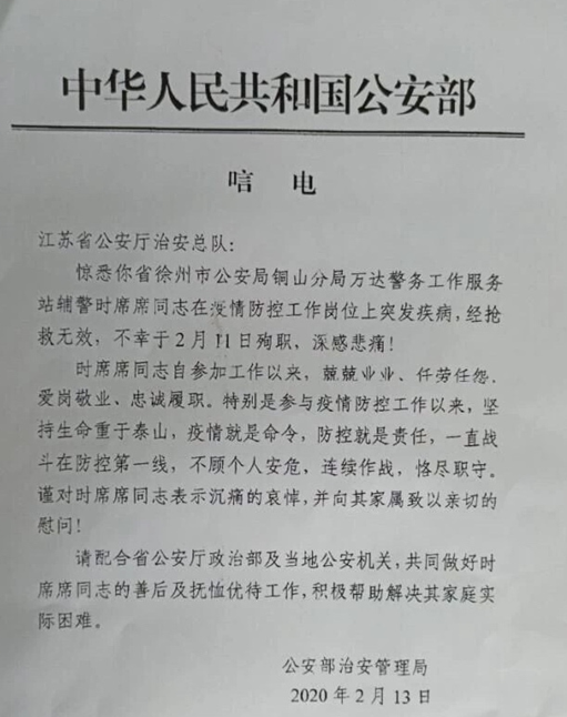 交汇点讯 30岁的灿烂生命就这样戛然而止,倒在了抗疫一线。2020年2月11日晚9时许,在连续奋战17天后,徐州市公安局铜山分局巡特警大队辅警时席席在巡特警大队宿舍内突发疾病,经全力抢救无效去世,年仅30岁。