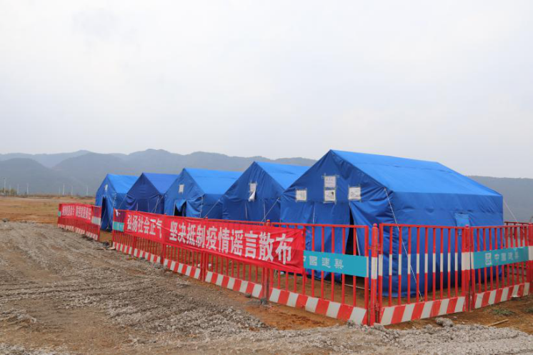 公路建设的特点是野外作业点较为分散且人员不集中,针对此情况,疫情期间,为了尽可能降低疫情防控风险,该项目部在每个工作点均设立隔离区,每个隔离区由6个3.2m×3.7m的帐篷组成,帐篷内配有两张单人床,一张桌子,并提供有消毒水、口罩、温度计、酒精、洗手液、矿泉水及方便面速食等物资。