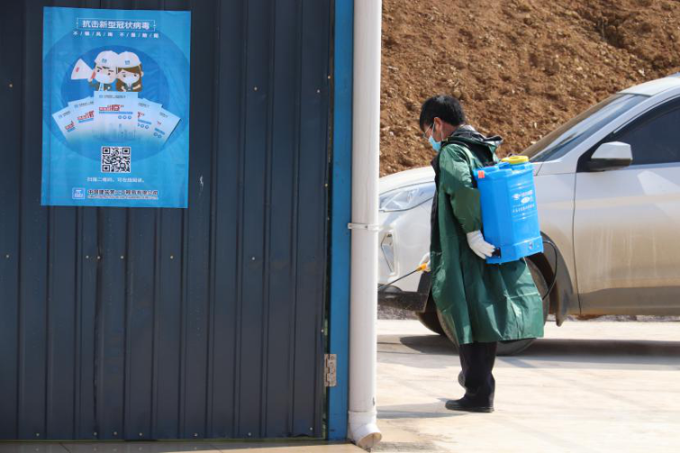 疫情期间,该项目部每天分时段,早上7点、中午12点、下午7点分别对办公区、生活区、野外作业区进行消毒,办公区域采取分散办公,一部分工作人员在办公室,一部份工作人员则在寝室办公。