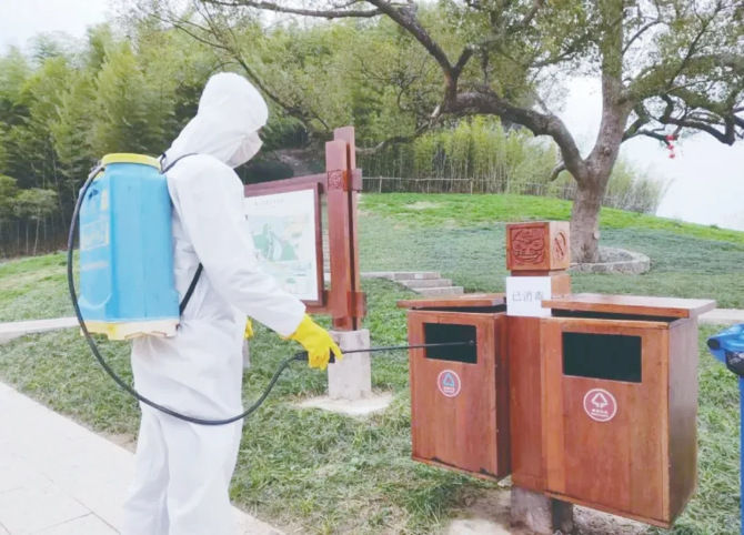 工作人员对良渚古城遗址公园内进行全面消杀不留死角,确保观众健康安全参观
