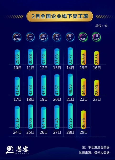 经济发展“动起来”,2月10日以来,全国企业线下复工率平均每周提升10%。思客联合极光大数据,对约10亿条人口迁徙数据进行分析,结果显示全国企业总体复工率由复工第一周的30%,上升至第三周的50%以上。