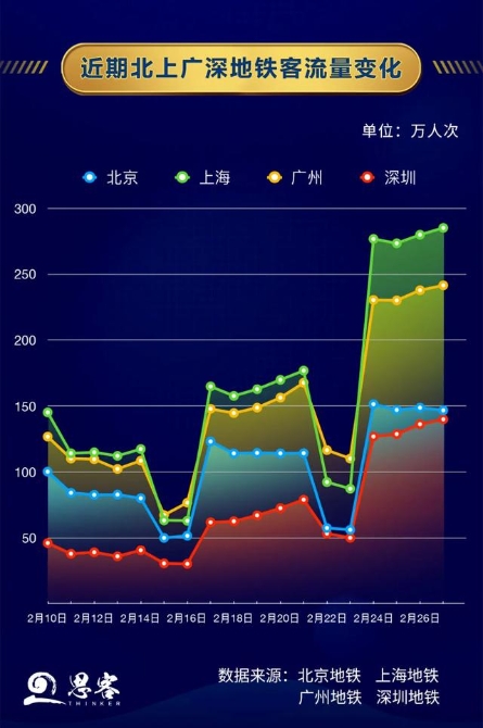 北上广深地铁客流量呈阶梯式增长,四座城市正在错峰、有序复工。2月10日以来,北上广深四城工作日地铁客流量与周末客流量有明显差距,每周客流人数较上周均有所增多,其中周一形成了人流“小高峰”。虽受远程办公、地铁限流、暂停尾号限行等影响,客流量与春节前相比仍有差距,但可以预测,四座城市的地铁客流量将随着复工率的提升逐渐增多。