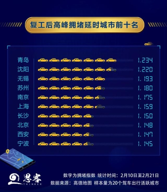 城市又开始奔跑,部分大城市拥堵趋势开始回升。复工的人流穿梭在城市中,随之而来的是车流增多、道路变“红”,青岛、沈阳、无锡、苏州、南京等地的民众已经开始体验复工堵车的“烦恼”,“第一次看到堵车会开心”还登上了微博热搜,有网民说“久违的堵车让我看到城市在复苏。”