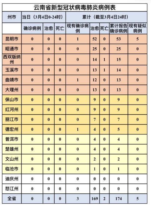 截至3月4日24时云南累计治愈出院169例 现有确诊病例3例