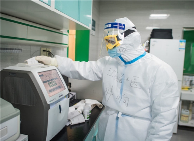 2月22日,在武汉市第一医院重症监护室,来自江苏医疗队1991年出生的李响在进行化验工作。新华社记者 肖艺九 摄