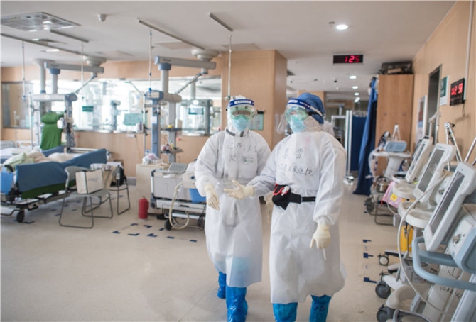 2月22日,在武汉市第一医院重症监护室,来自江苏医疗队的90后队员李雪(右)与同事沈艳交流。新华社记者 肖艺九 摄