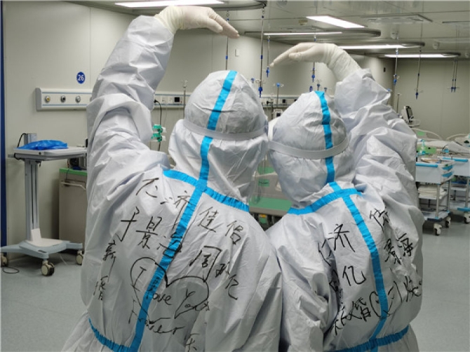 他们还会在防护服上创意手写,白色的防护服成为青春最酷的留白:“奥利给,精忠报国,疫情结束、我娶你……”用俏皮的话语为新时代中国青年代言。