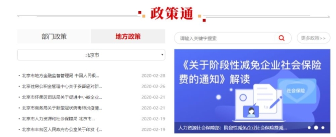 当前,各地区各部门纾困中小微企业的政策“大礼包”正在密集出台。“政策通”版块及时分类汇集了国务院各有关部门和各地区最新出台的有关支持小微企业、个体工商户复工复产的政策措施,以及相关政策的权威深度解读,包括复工复产、稳企稳岗、金融财税、缓缴社保、租金减免、水电气优惠政策等。办事企业和群众在快速查询相关政策的同时,还可以一站式在线办理相关服务业务,并及时反馈对相关政策服务的意见建议。
