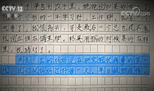 “今年春节我是在长春过的。除夕的那一天,全家人一起包了饺子,但是我的妈妈还在研究冠状病毒的第一线……”