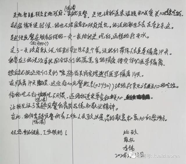 “在隔离点14天里,这位好心民警给我打来电话,关心我吃住,怕我吃不好,还给我送来零食和关心……”李伟在感谢信中写道。
