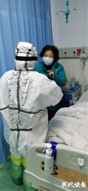 △武汉市中医院的护士在防护服上写着中医理论的名句