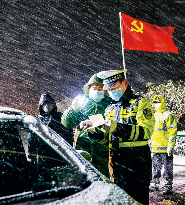 新冠肺炎疫情发生后,安徽省合肥市庐江县公安、交通、医疗卫生等部门联手作战,严把车辆人员入口关。图为2020年2月15日夜,公安民警冒着严寒在风雪黑夜里坚守疫情防控岗位,甘做人民群众的安全“守夜人”。 中新社 左学长/摄