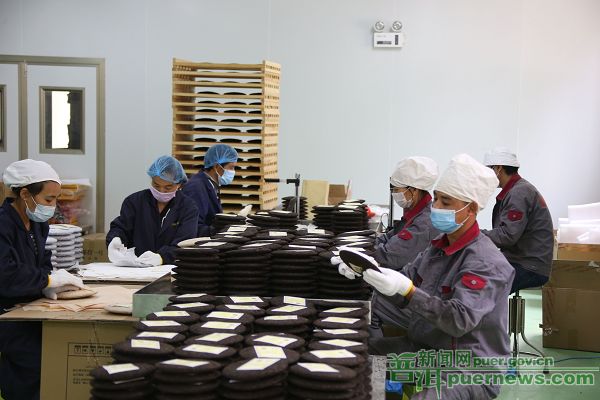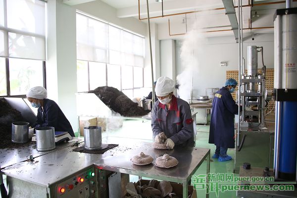 △普洱新华国茶有限公司的工人忙着包装茶饼(记者王承吉 摄)