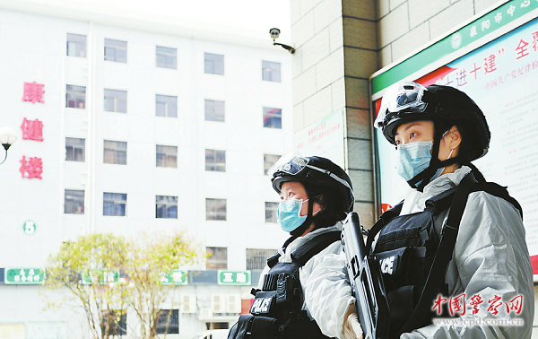 襄阳市公安局特警支队民警在市中心医院发热门诊外值守。