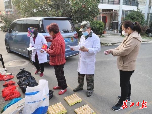 “1栋701油一壶、2栋902蔬菜一份、5栋502两斤肉……”3月7日中午11时许,46岁的新洲区退役军人吴楚文忙着为小区居民发放采购的生活物资。