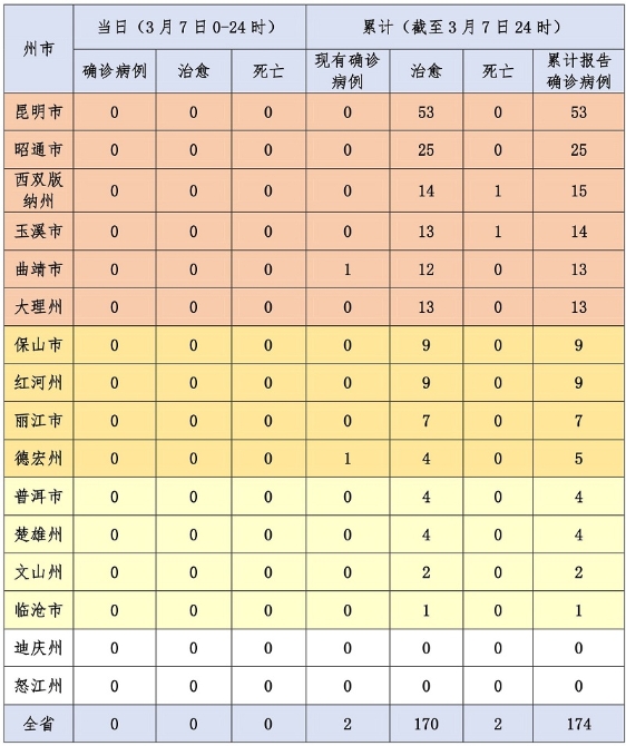 3月7日12时至24时 云南新增0例累计174例