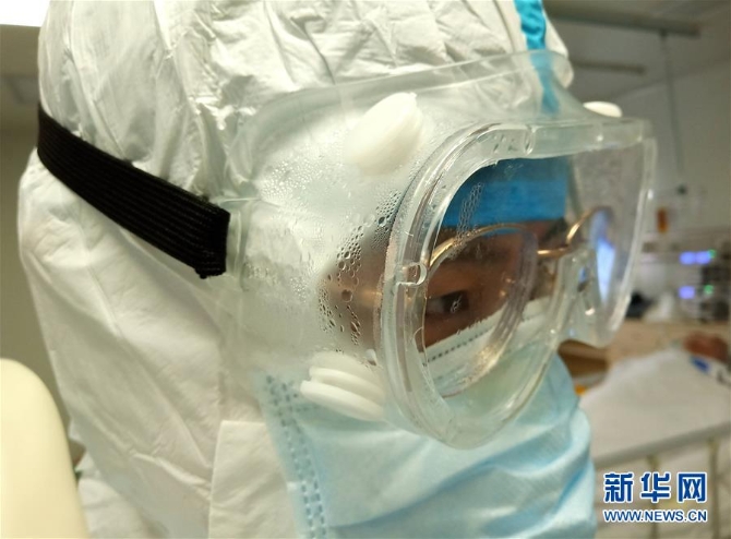 2月24日,在武汉市第七医院ICU,护士陶晓琳护目镜上布满水汽。 新华网发 熊芳 摄