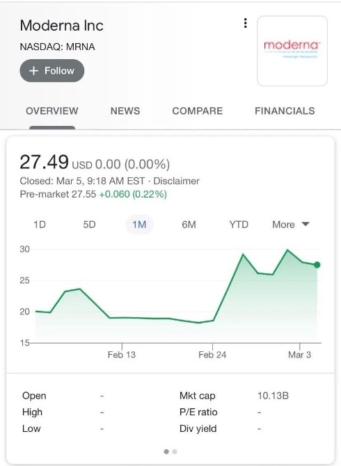 北京时间3月5日Moderna股价走势