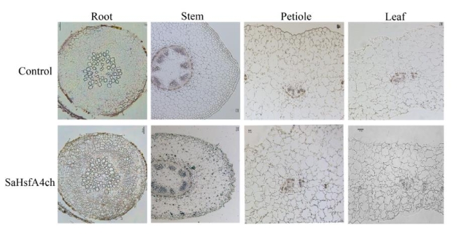 图为SaHsfA4ch蛋白在不同组织中的免疫组化定位-根、茎、叶柄、叶