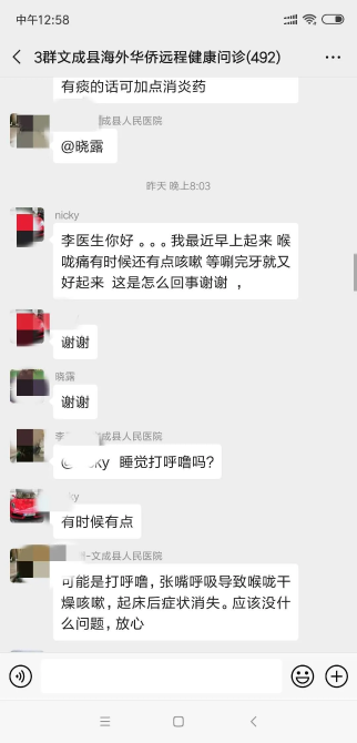 对于“问诊群”的建立,文成县人民医院医务科科长田毅表示好处多多,医院的问诊团队不仅会针对目前如何做好防疫个人防护进行知识解答,还会提供一些常见的疾病症状处置和健康知识解答,通过“线上诊疗”,使防疫个人防护措施入脑入心,尽可能减少感染风险,也适度减少侨胞们因疫情当前而产生的恐慌心理。