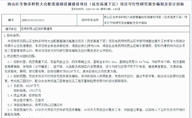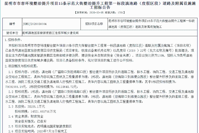 昆明信息港讯(昆明日报 全媒体记者孙莹)近日,昆明滇池国家旅游度假区住房和城乡建设局发布《昆明市市容环境整治提升项目15条示范大街整治提升工程第一标段滇池路(度假区段)道路及附属设施施工招标公告》;昆明市西山区城市管理局发布《西山区生物多样性大会配套基础设施建设项目(昆安高速下层)项目可行性研究报告编制及设计招标》公告,公告涉及的这两条城市主干道将进行整治提升。其中,滇池路(度假区段)要求于7月31日前完工。