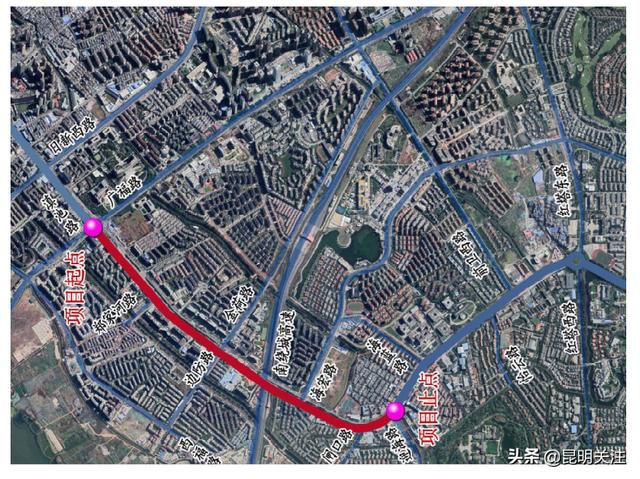 昆安高速下层,东起明波立交、西至高峣立交,道路全长约6.2km,道路红线宽38.5m~50m,为城市主干路。相交道路有海源南路、华苑路(三环辅道)、益宁路、大渔路及规划区内主要通道,设计内容包括但不限于行车道、辅道病害整治、交通设施、市政管线、照明、绿化景观等,投资估算约为89297万元,具体投资以立项批复为准。