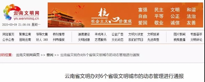近日,云南省文明办根据《云南省文明城市、文明村镇、文明单位创建管理办法》,对云南省6个省级文明城市的动态管理情况进行了通报:
