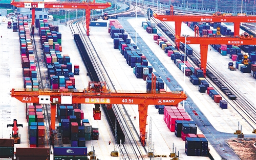 目前,江西省赣州国际陆港各类班列以及企业已陆续进入常态化运营。图为该港吊装货物场景。刘青摄(中经视觉)