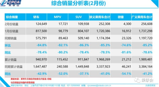 3月9日,乘用车市场信息联席会发布数据显示:2月,受疫情冲击,我国狭义乘用车销量仅为252308辆,环比下滑85.3%,同比巨跌78.5%,完全背离历史走势。
