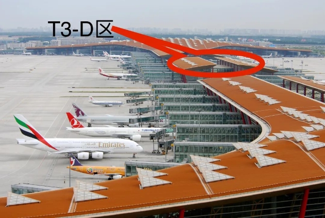 在这里跟大家说明一下。T3-D是相对独立的一个楼,大家以往在三号楼乘坐飞机的时候,偶尔会遇到即使是国内航班也要搭乘小火车才能出发,这时候到达的就是T3-D的这个区域了。