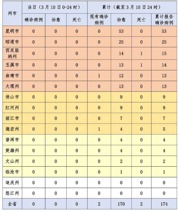 昆明信息港讯 机器人小明 3月10日12时至24时,无新增确诊病例。截至3月10日24时,已连续19天新增病例为0,全省累计确诊病例174例,治愈出院170例,死亡2例,现有确诊病例2例,无重症、危重症病例。