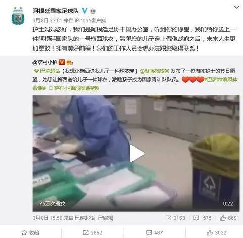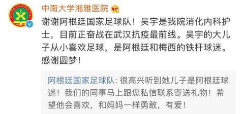9日上午,中南大学湘雅医院官微在阿根廷国家足球队官微下方留言并表示感谢。随后,阿根廷国家足球队官微回复,他们会马上与湘雅医院联系寄送礼物!“希望他会喜欢,和妈妈一样勇敢,有爱!”