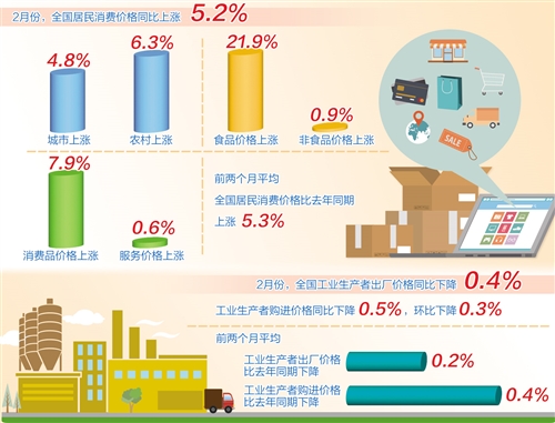 3月10日,国家统计局公布了2月份全国居民消费价格指数(CPI)和工业生产者出厂价格指数(PPI)数据。2月份,CPI同比上涨5.2%,涨幅比上月回落0.2个百分点;PPI同比下降0.4%。