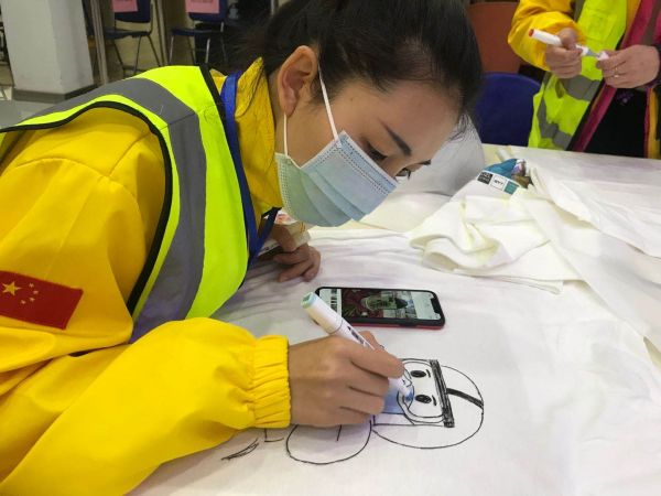 武汉志愿者在T恤上涂鸦 徐敬阳 供图