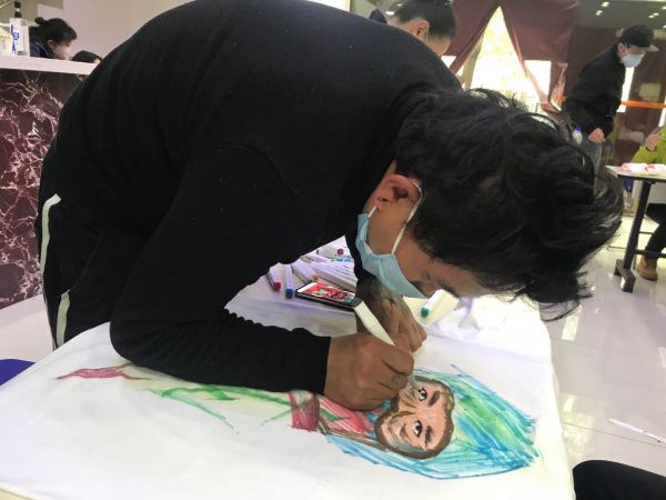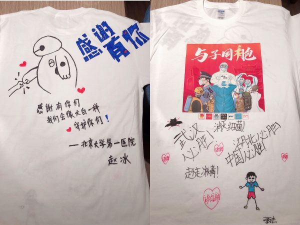 武汉志愿者在T恤上,为医护人员涂鸦 徐敬阳 供图