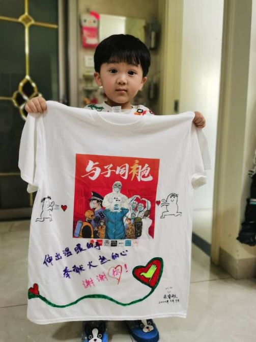 “医护人员拿到文化衫后,都非常高兴,她们说小朋友画得太好看了。”徐敬阳说。